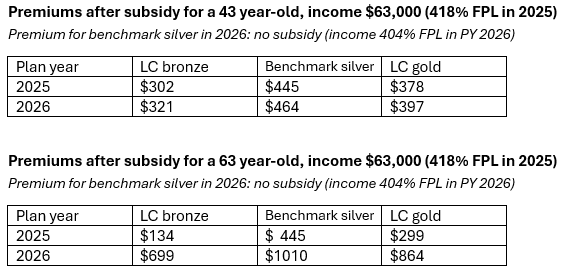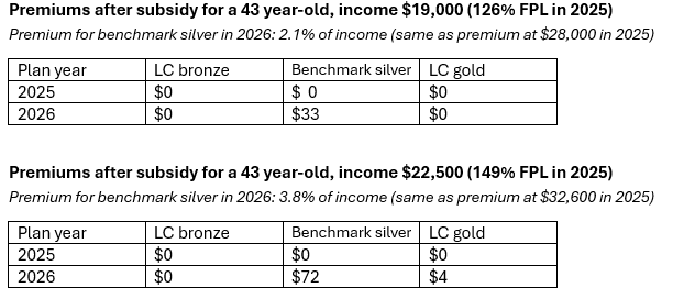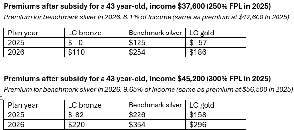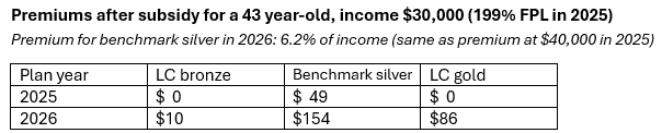 If you rub the ARPA-enhanced subsidies out of your vision, the gold premium discount in this market looks pretty attractive at these incomes. At the $45,200 income level, 289% FPL in 2026, while benchmark silver will cost 9.8% of income, lowest-cost gold will cost just 8.0% of income if this year’s silver-gold premium spread holds. That “discount” is not nothing. The lowest-cost gold premium remains below the ARPA-enhanced maximum for benchmark premiums, 8.5% of income.