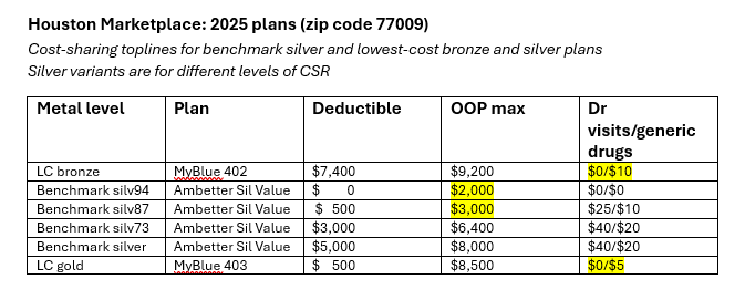 Here, first, is an overview of out-of-pocket cost exposure for the benchmark silver and lowest-cost bronze and gold plans in Houston in 2025. The four levels of silver reflect the three levels of CSR (AV 94%, 87% and 73%), along with silver with no CSR (AV 70%). Bronze AV is 60%, and gold is 80%.