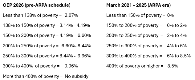 Below is the marketplace’s subsidy schedule** for 2026, compared to the ARPA-enhanced schedule in effect now, in 2025.
