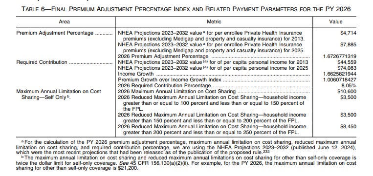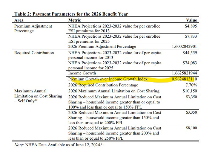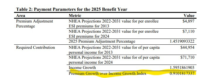 The “applicable percentages” that KFF used in its 2024 estimate of enrollees’ premiums for 2024 were taken from a CBO calculation of what the subsidy schedule in 2025 would have looked like if the enhanced subsides were not in place. Every year (pre-ARPA), an adjustment to the applicable percentages was derived from a calculation of inflation in health insurance premiums divided by wage growth (the Premium Growth over Income Growth Index). When the index was below 1.0, applicable percentages would drop in the year to come; when it was above, they would rise. As that index (let’s call it PGIGI) is also used to calculate growth in maximum allowable out-of-pocket costs in marketplace plans, as well as the Required Contribution Percentage (don’t ask, or rather see note below), it continued to be calculated and published in the ARPA era.