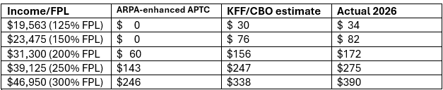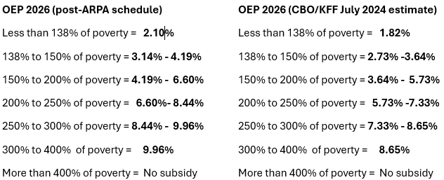 In its July 2024 estimate (still widely cited until yesterday), KFF used a subsidy schedule for 2026 that CBO had derived from the PGIGI for 2025, published in a June 2024 letter to Congressional leaders who had inquired about the cost of extending the ARPA subsidies. That was I believe the lowest PGIGI ever - 0.910, and it led to the lowest applicable percentages ever.