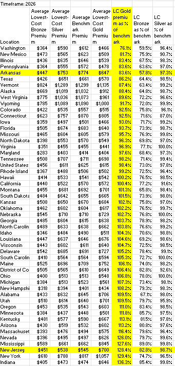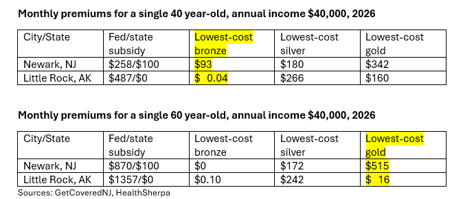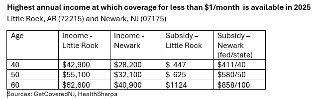 * All enrollment statistics cited above are derived from CMS’s 2025 Marketplace Open Enrollment Public Use Files. The state price spreads from the benchmark are derived from this KFF table. (I added columns dividing average premiums for lowest-cost bronze and gold plans by the average benchmark premiums. Snapshots are at bottom.) Plan pricing in Little Rock and Newark at different incomes and ages is drawn from the e-broker HealthSherpa for Little Rock and GetCoveredNJ for Newark (as HealthSherpa does not incorporate state supplemental subsidies).