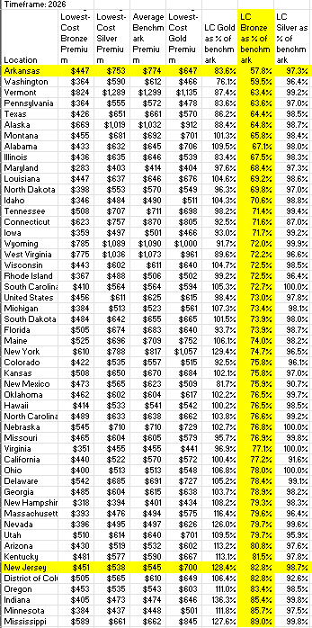 Here, we’ll contrast current plan offerings in a state marketplace with some of the most extreme silver loading effects, Arkansas, with a state where the effects are among the weakest, New Jersey.