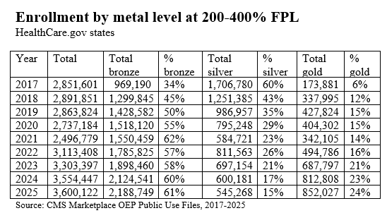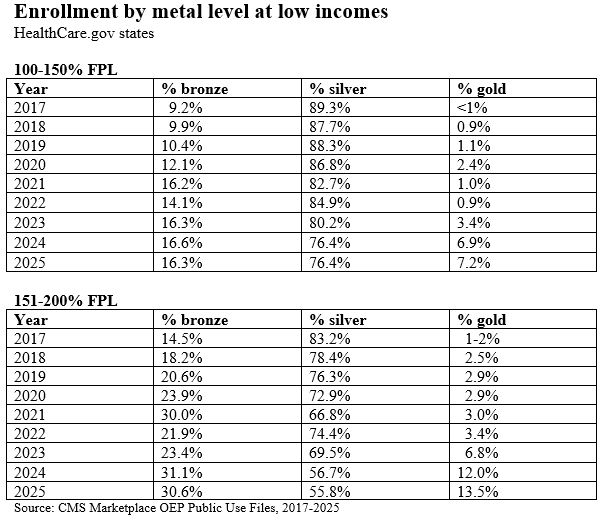 Weak or strong silver loading has been in place in almost all states since 2018, and as a result, silver plan selection has collapsed at incomes over 200% FPL (where CSR is weak or unavailable) as well as eroding at incomes under 200% FPL. Note above that gold plan selection as well as bronze plan selection has increased at low incomes. Much of the gold selection increase is concentrated in Texas, where gold plans are far cheaper than silver. In 2025, almost 900,000 Texas enrollees with income under 200% FPL enrolled in gold plans. That’s about 6% of all enrollees with income under 200% FPL nationwide.