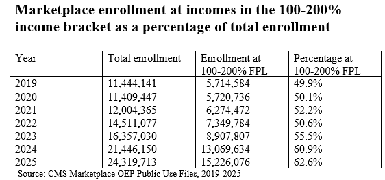 There’s reason to believe that massive sticker shock when the first 2026 premium bills arrive — with subsidized premiums for a benchmark silver plan more than doubling on average from 2025 to 2026 — will drive the ratio between OEP enrollment and February effectuated enrollment back to Obama-era levels this year, or even lower. Further, since Republicans have terminated year-round enrollment for enrollees with income below 150% FPL, average monthly enrollment in 2026 will drop even further compared to 2025. That change won’t be evident until mid-year 2027.