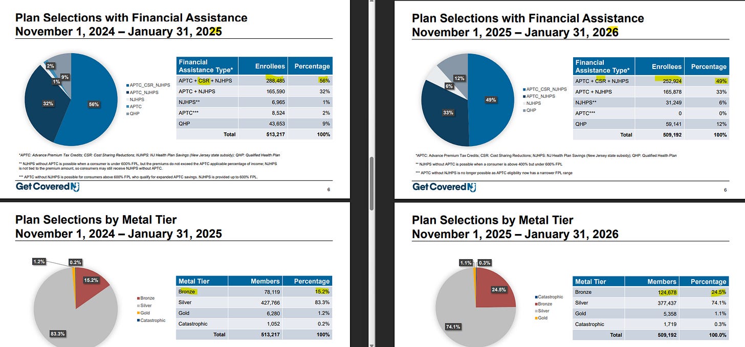 Using that 82% average AV for silver enrollees, by my calculations the average AV obtained by all enrollees at all metal levels in the New Jersey marketplace was 79.5% in 2025 and 78.1% in 2026.